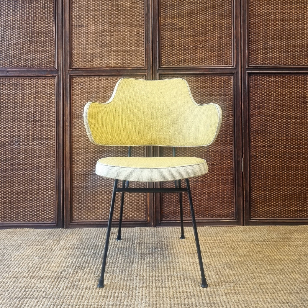 - 2 tone lemon and white colored upholstered seat and back with feature studs, on tubular steel base and plastic leg tips.