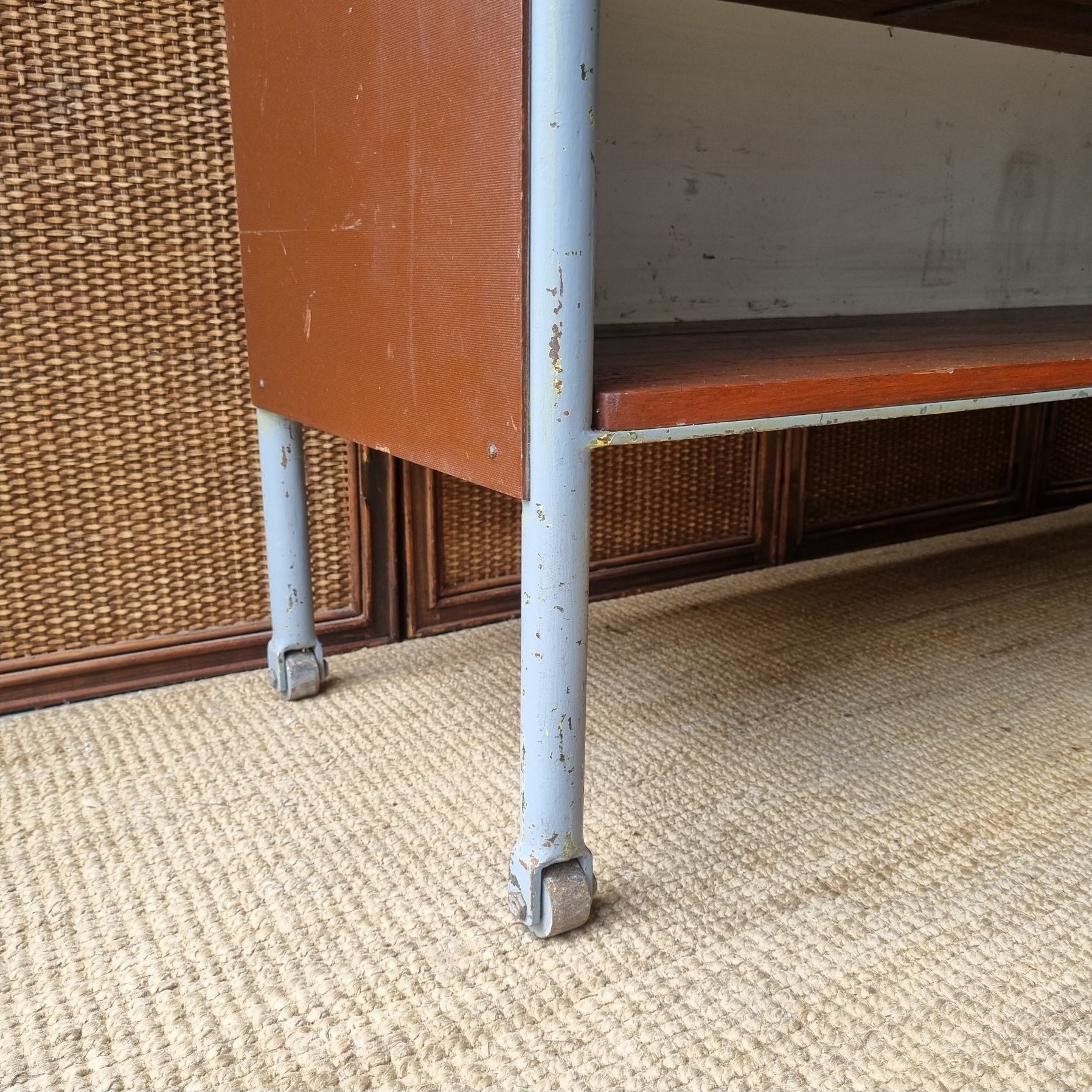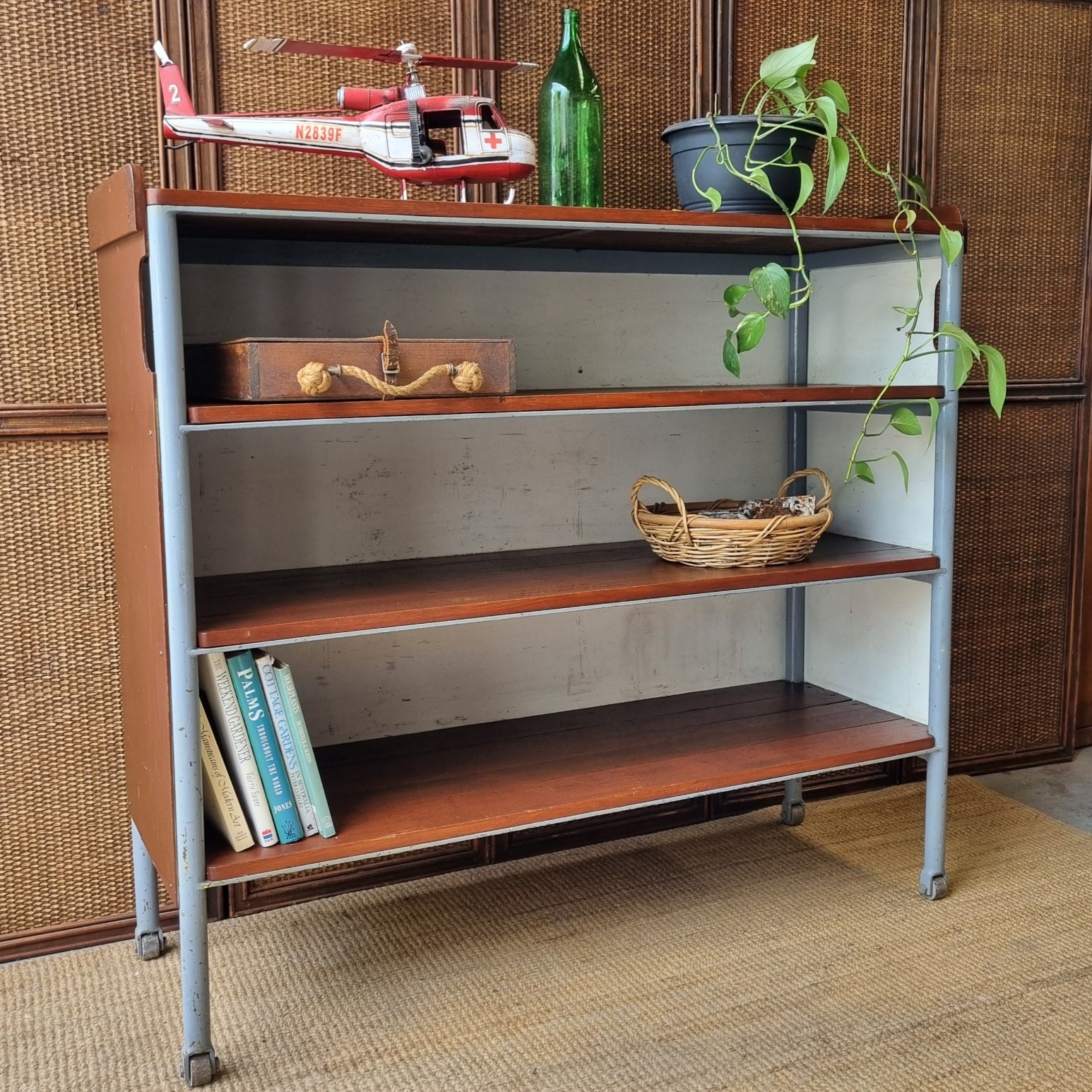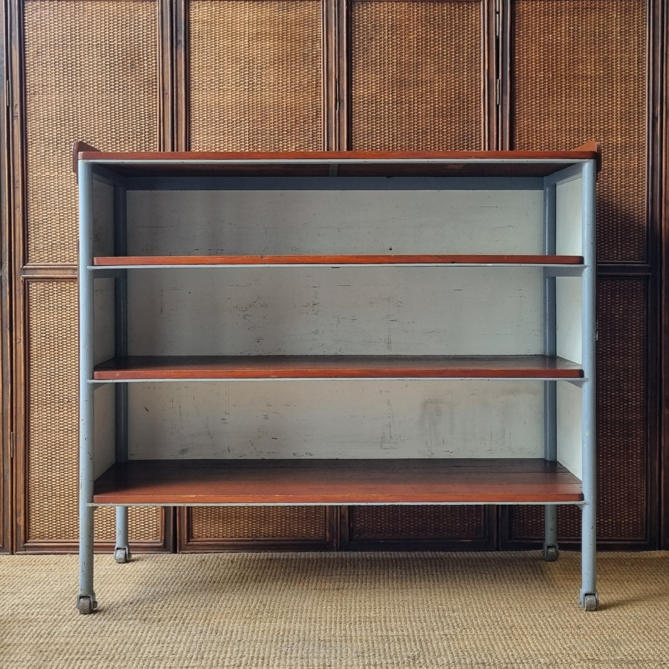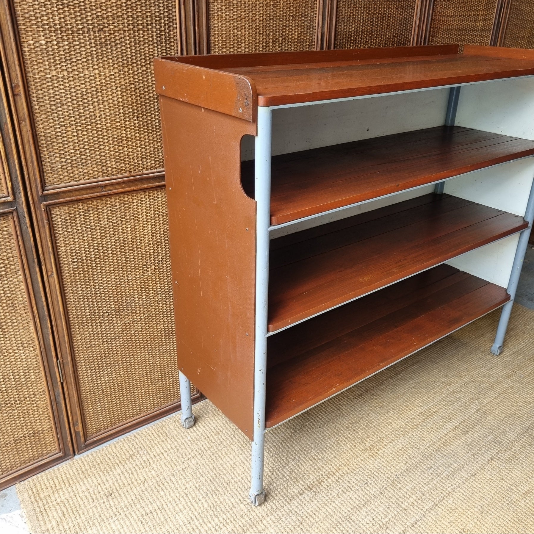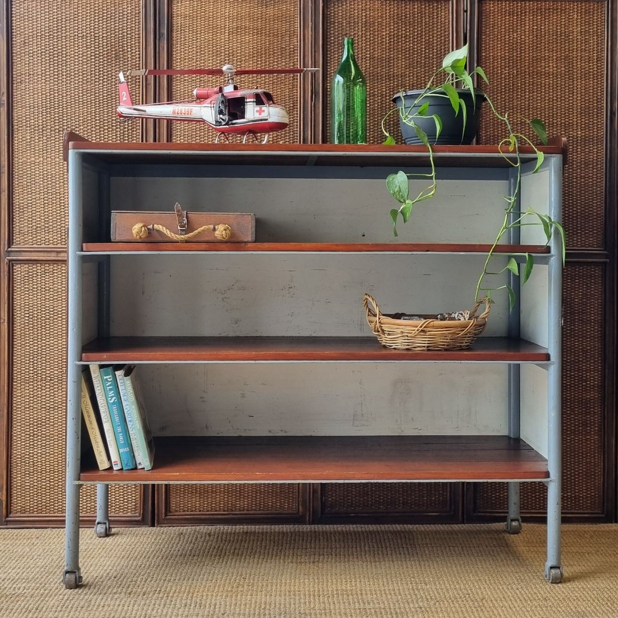 - Tubular steel frame, hardwood shelves, panelled sides, cut out handles and wheels.