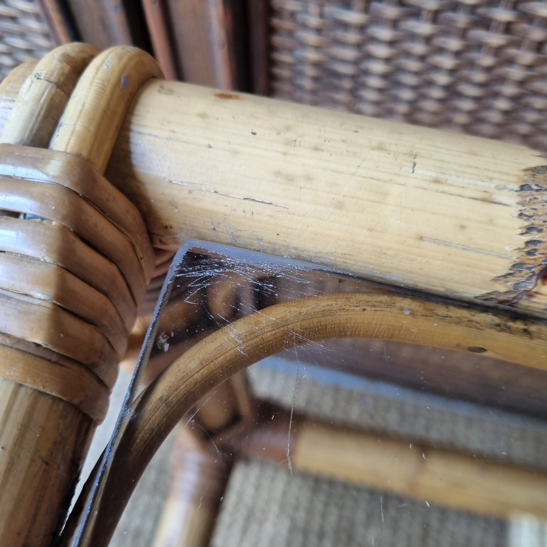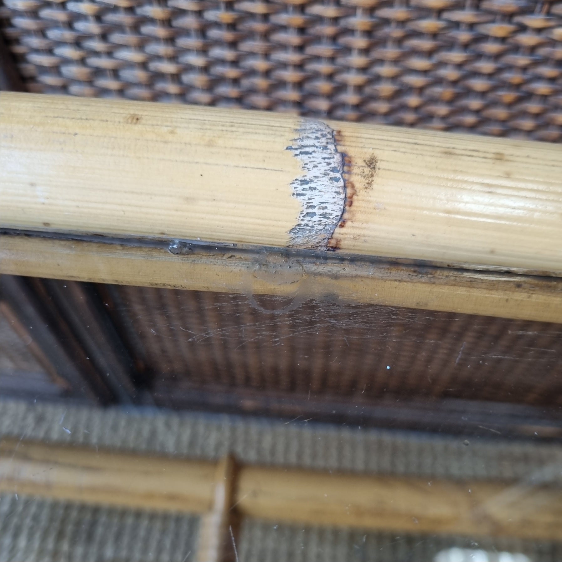 - Very good condition. The cane frame is in fantastic condition with all binding intact. The glass top has a fair amount of light scratches and 1 or 2 other blemishes.  Overall it presents very nicely.