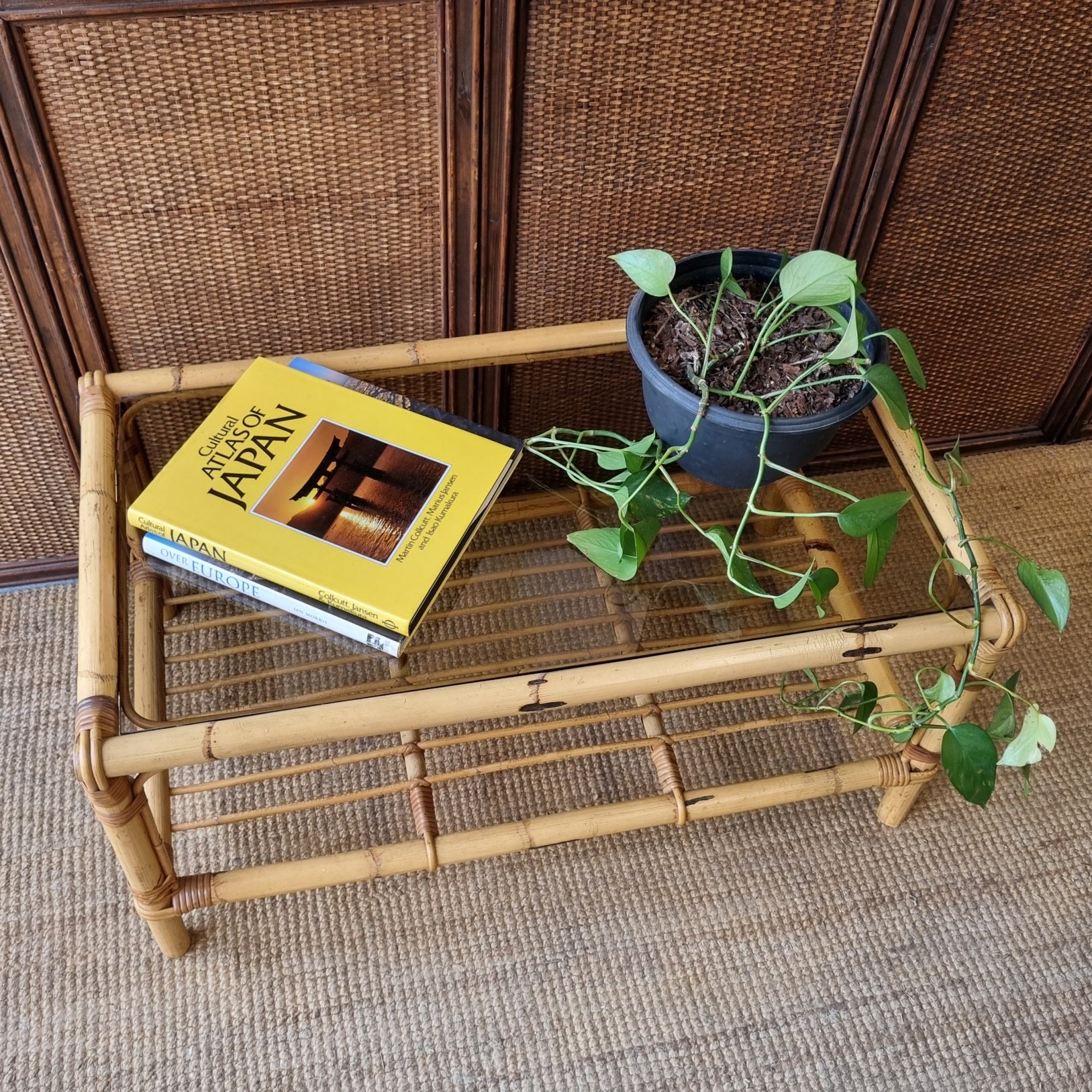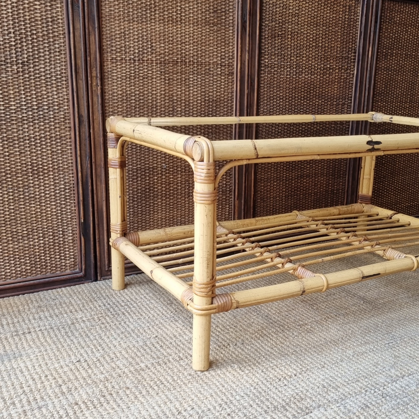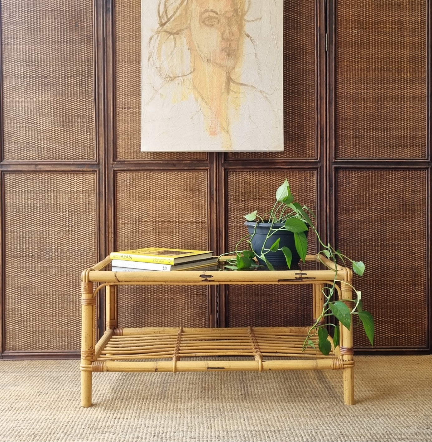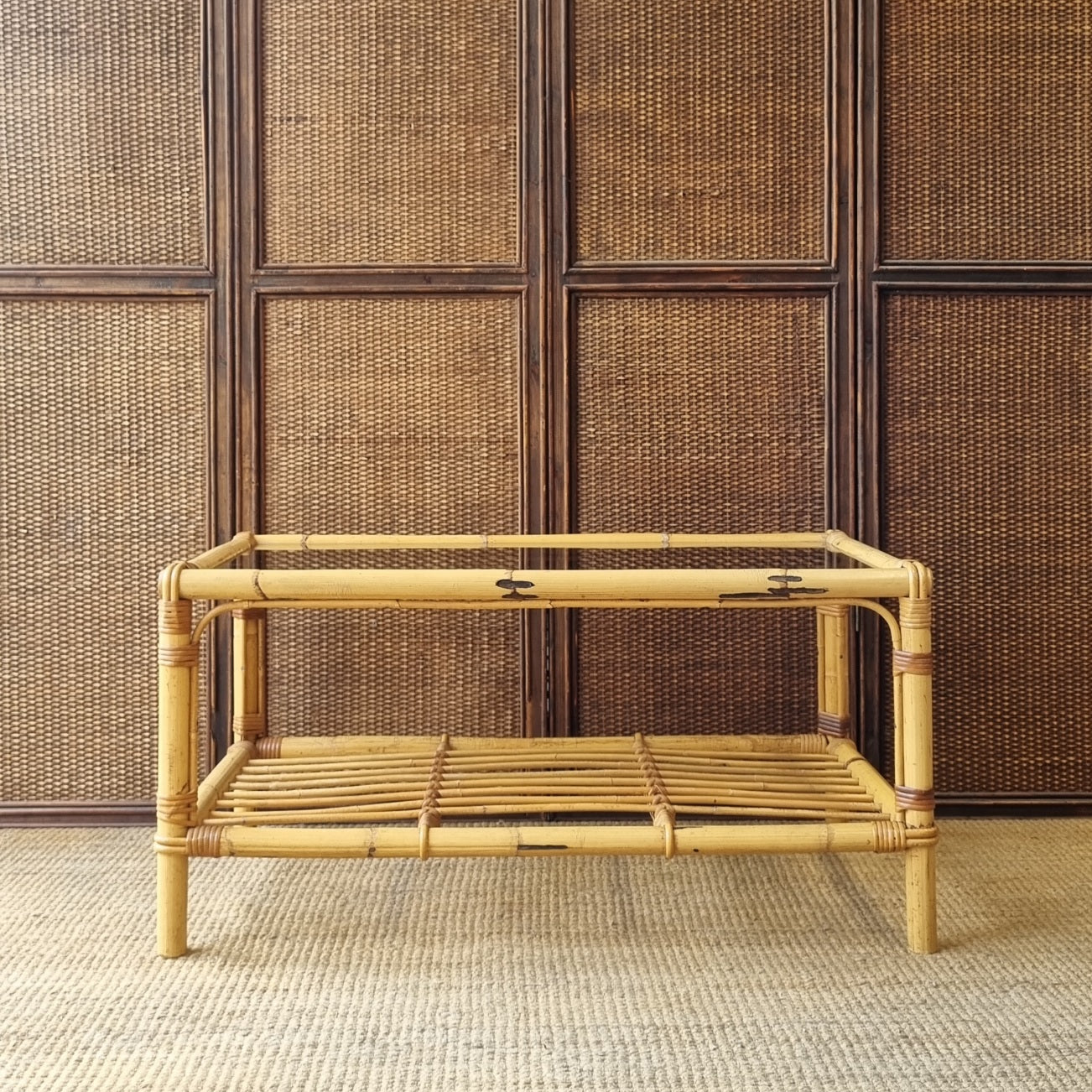 - Cane coffee table with smoked grey glass top and magazine rack.