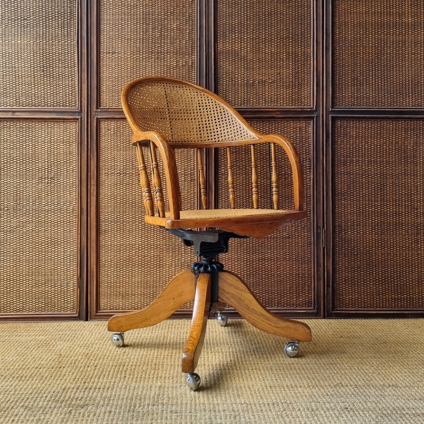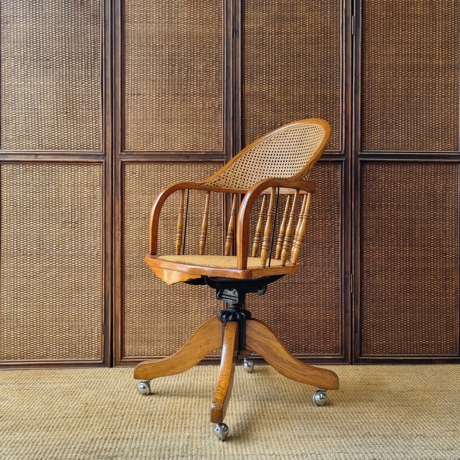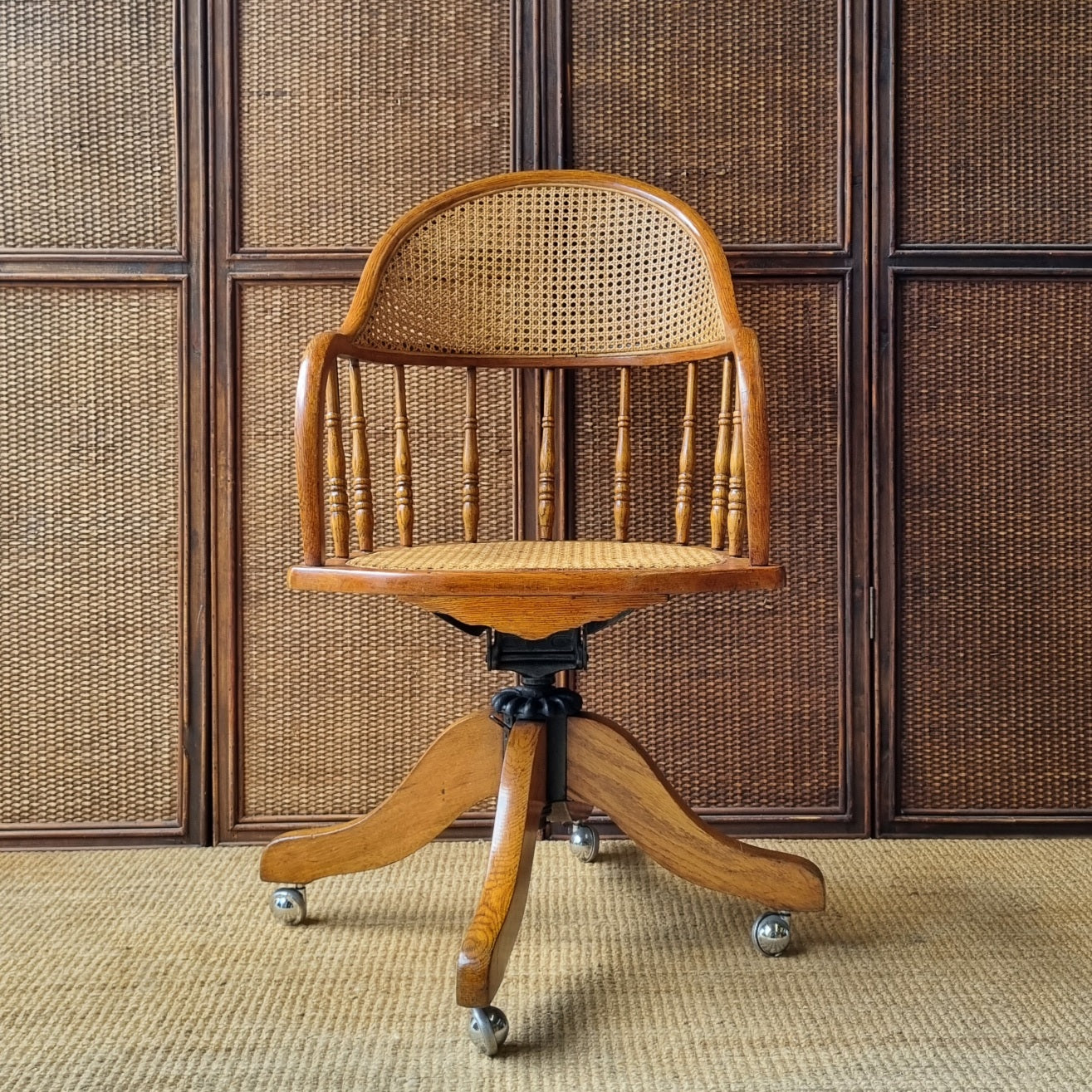 - Stunning vintage office swivel chair made from American Oak with rattan seat and back. Also referreed to as bankers and bookkeepers chairs.