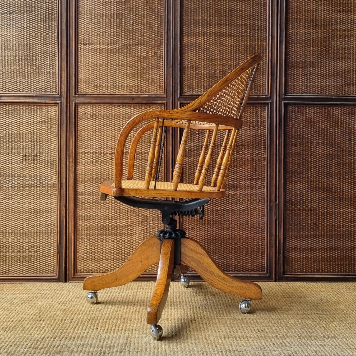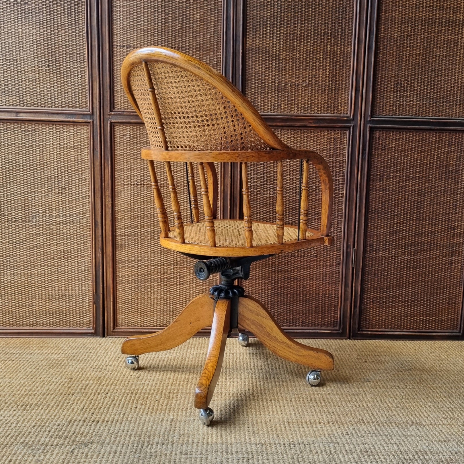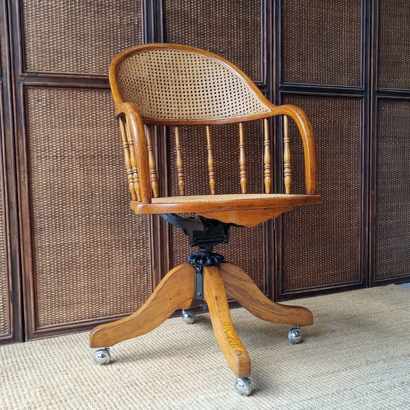 - Stunning vintage office swivel chair made from American Oak with rattan seat and back. Also referreed to as bankers and bookkeepers chairs.