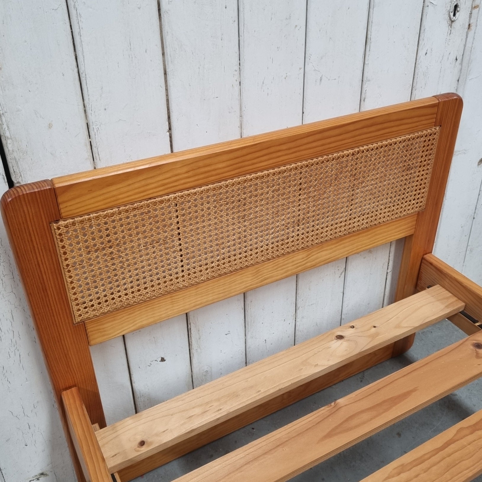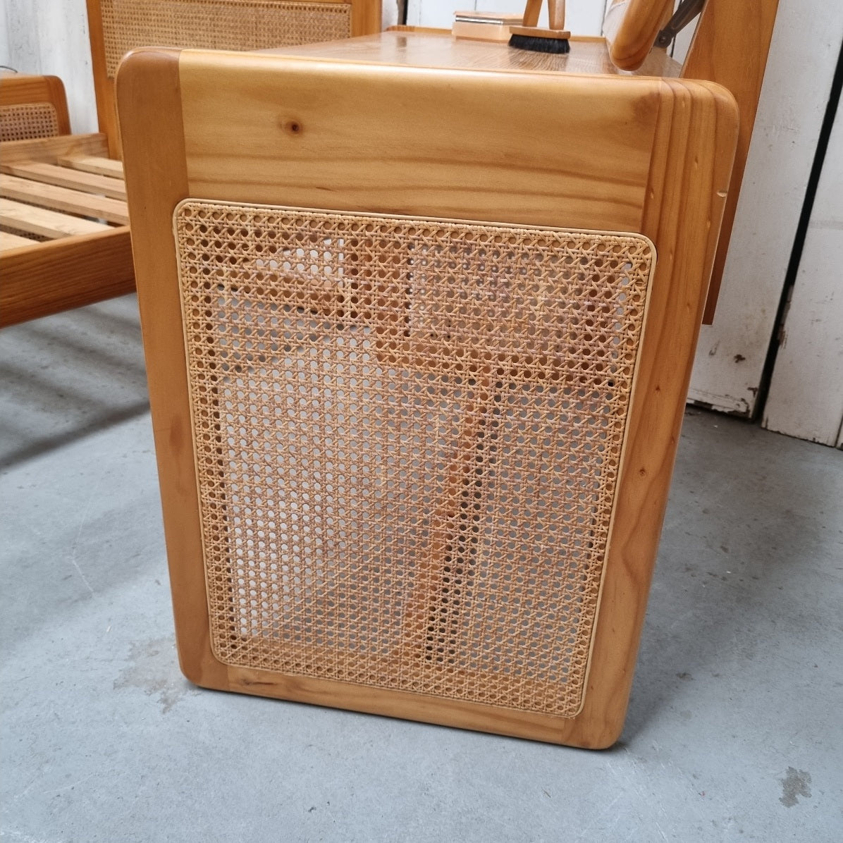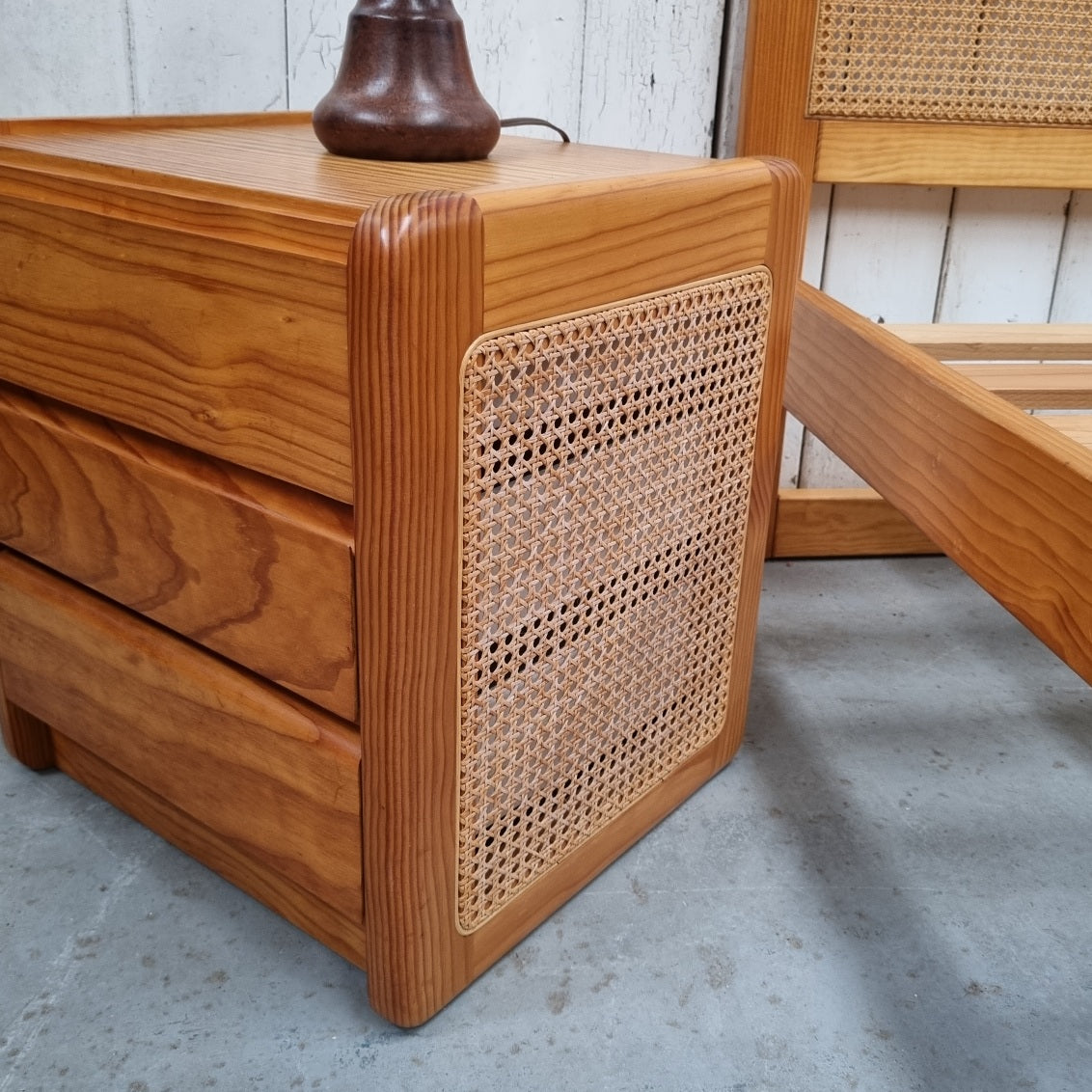 - Solid and veneered pine with rattan panels 3 piece bedroom suite.