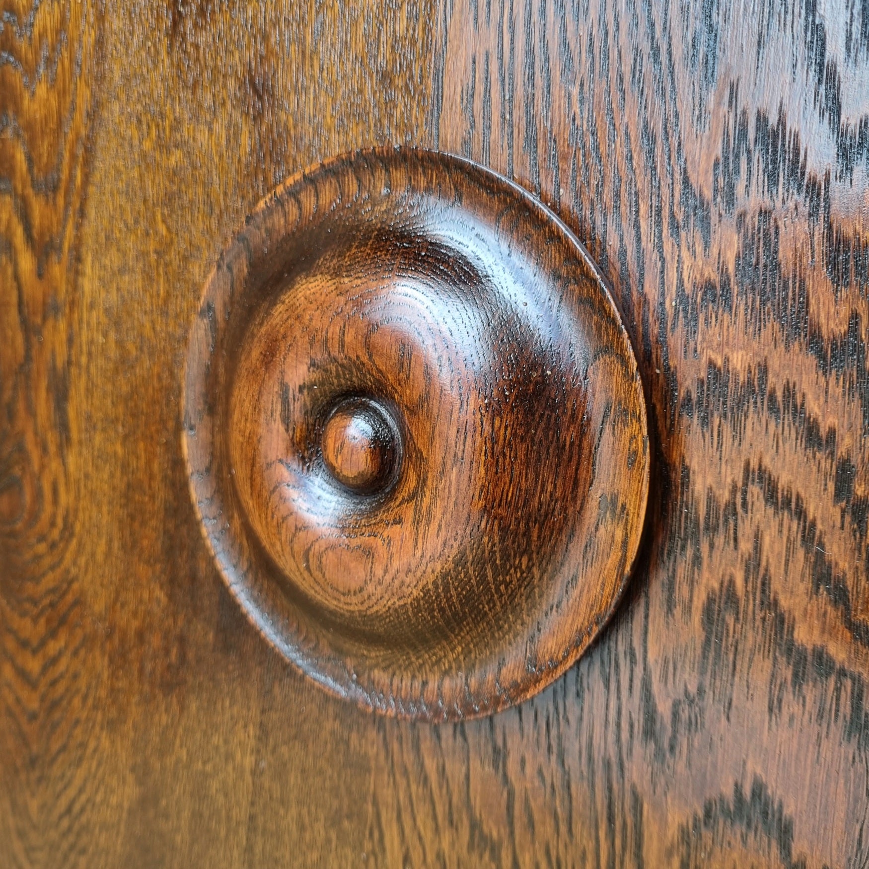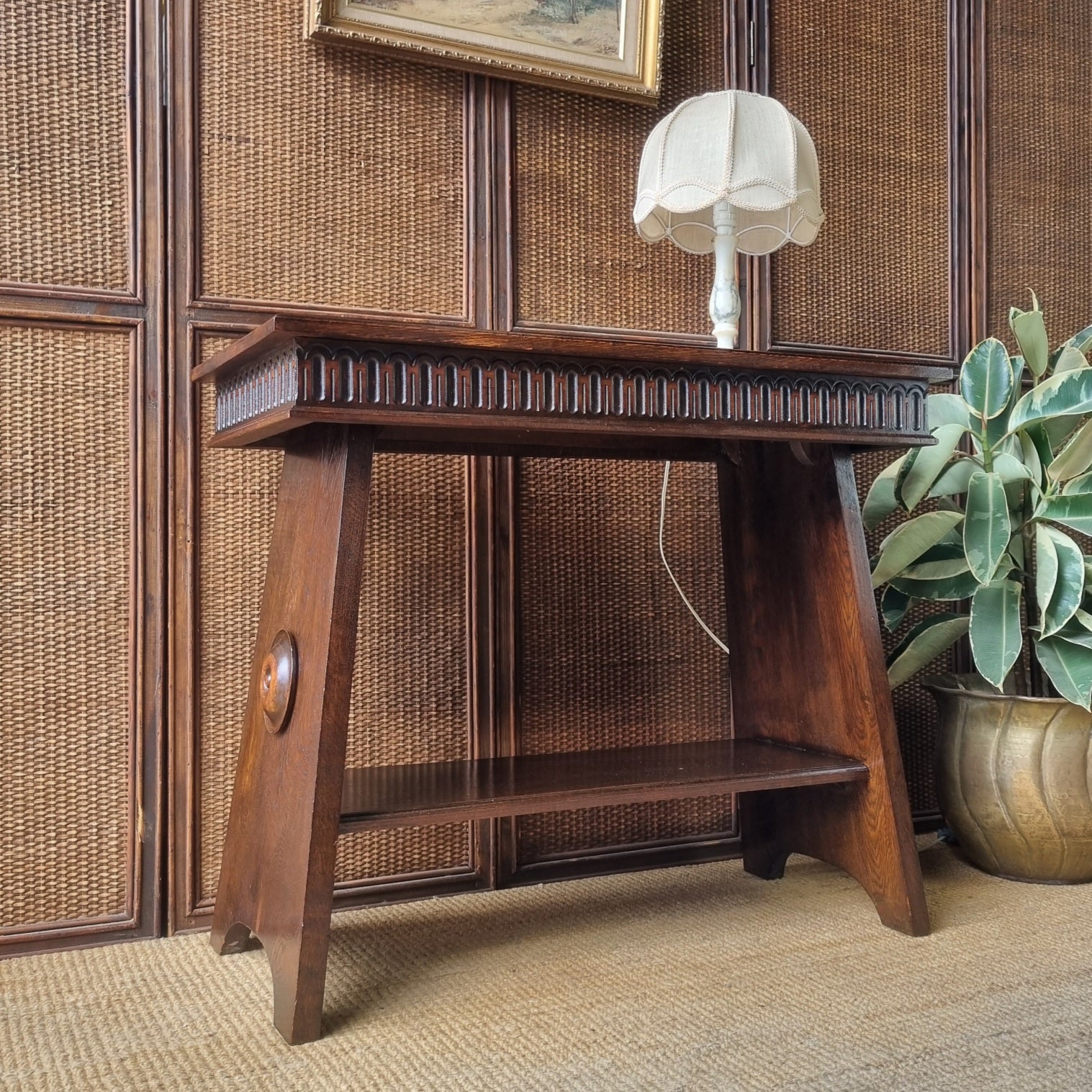 - Featuring geometric carved detail along the apron, angular slab legs, stretcher shelf, and a round 'boss' on each end.