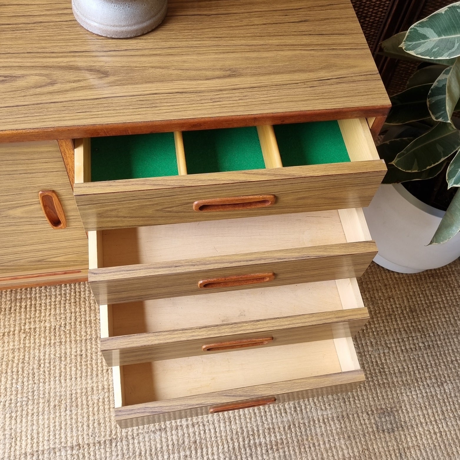 - Cabinet to one side with 2 sliding doors and removable shelf. 4 drawers on the other side, with green felt lined cutlery compartments in one.