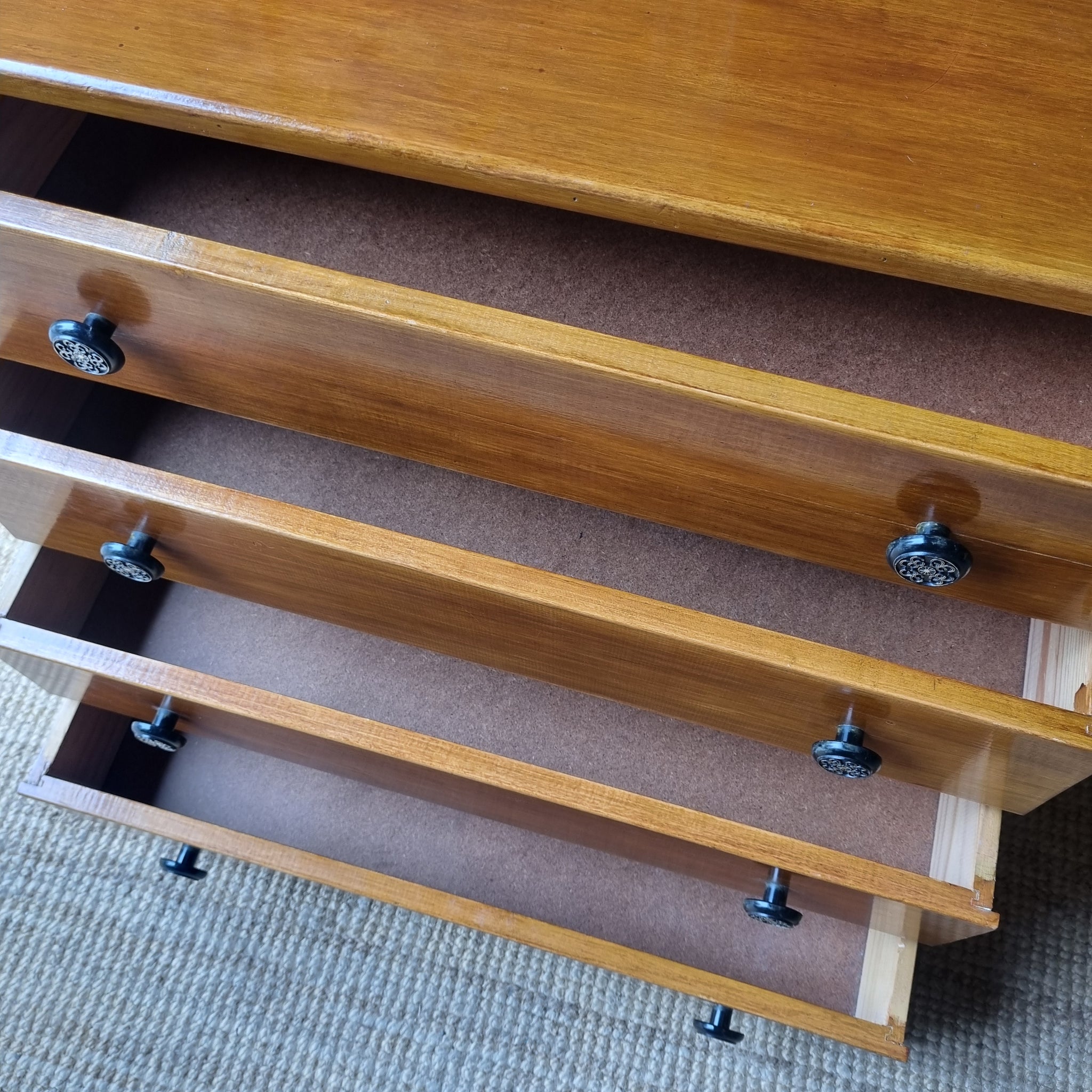 - Furniture grade plywood casing with Tasmanian Oak drawer fronts and black round pulls.