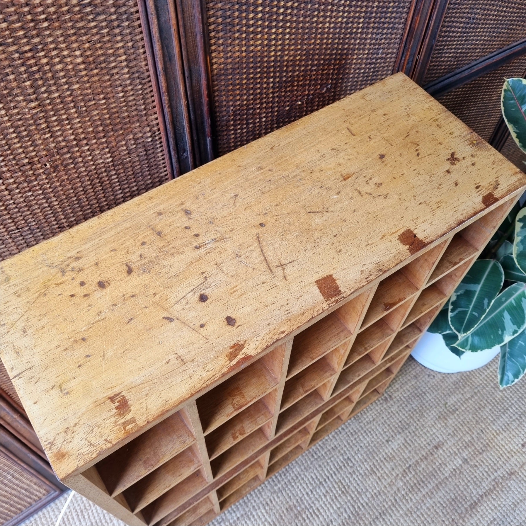 - Vintage pigeon hole storage unit on metal castor wheels.