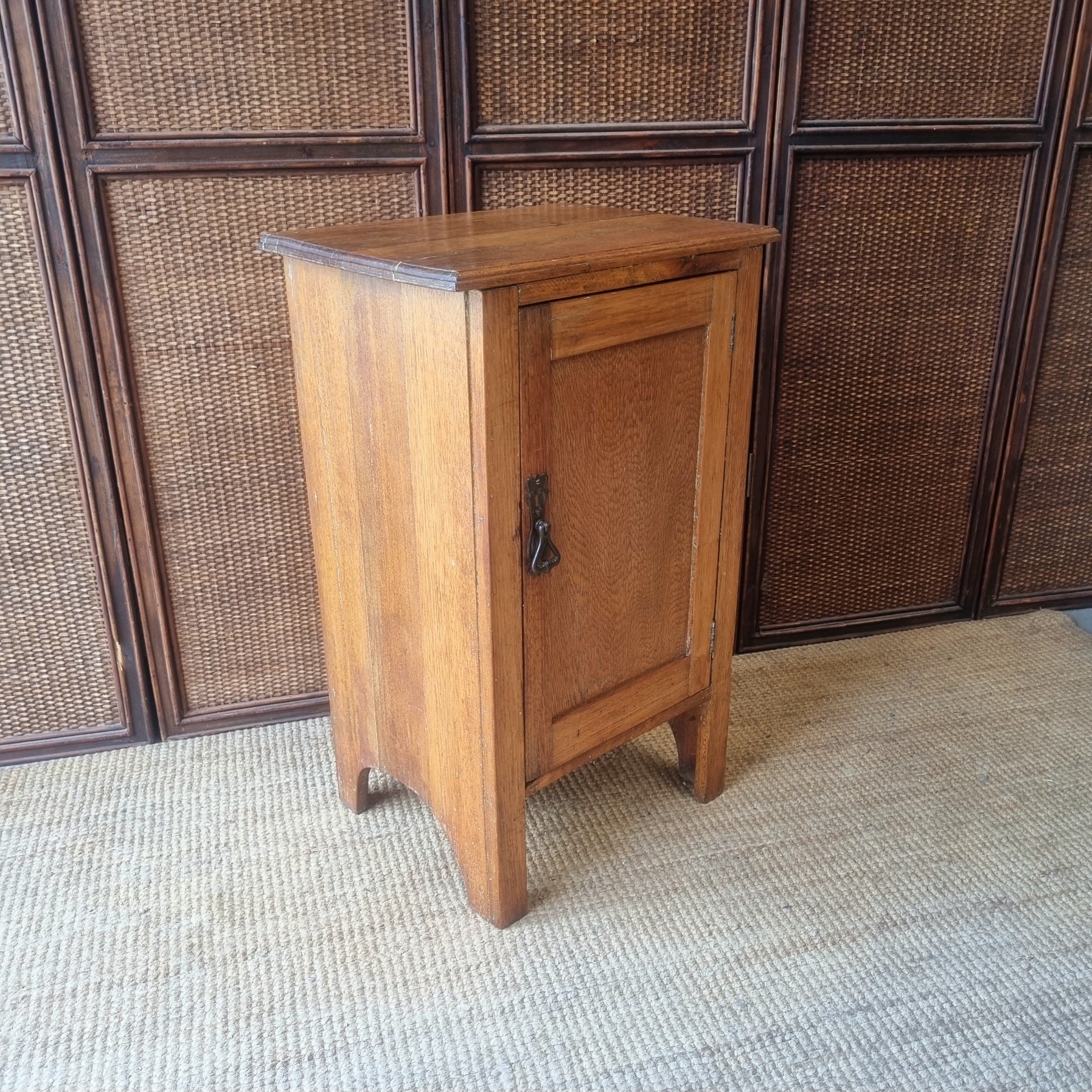- Solid oak with fixed internal shelf and working latch handle.